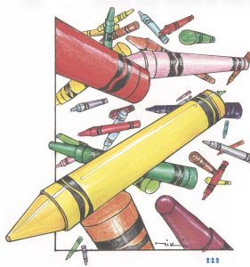 “My elbow? My ear? My vermiform appendix?” I asked, but obediently closed my eyes and ran my fingertips across the waxy cylinders. Is there anyone alive who doesn’t love the smell of new crayons? I settled on one and pulled it out, opening my eyes.